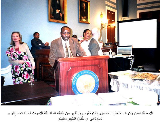 الاستاذ/ امين زكريا- يخاطب الحضور بالكونغرس ويظهر من خلفه الناشطة الامريكية نينا شاه بالزى السودانى والفنان الكبير سليدر