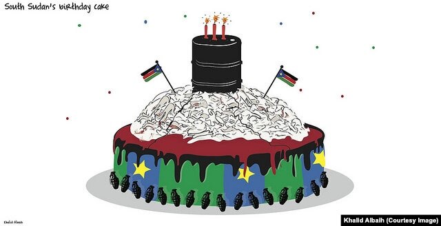 A cartoon birthday cake by Sudanese cartoonist Khalid Albaih to mark the third anniversary of South Sudan's independence on July 9, 2014.“Part of my family is from South Sudan. It’s such a shame because I had so much hope for that new nation. We thought it was going to be everything that Sudan is not. It’s young, it’s rich, it has all the factors to be the right country,” he said.