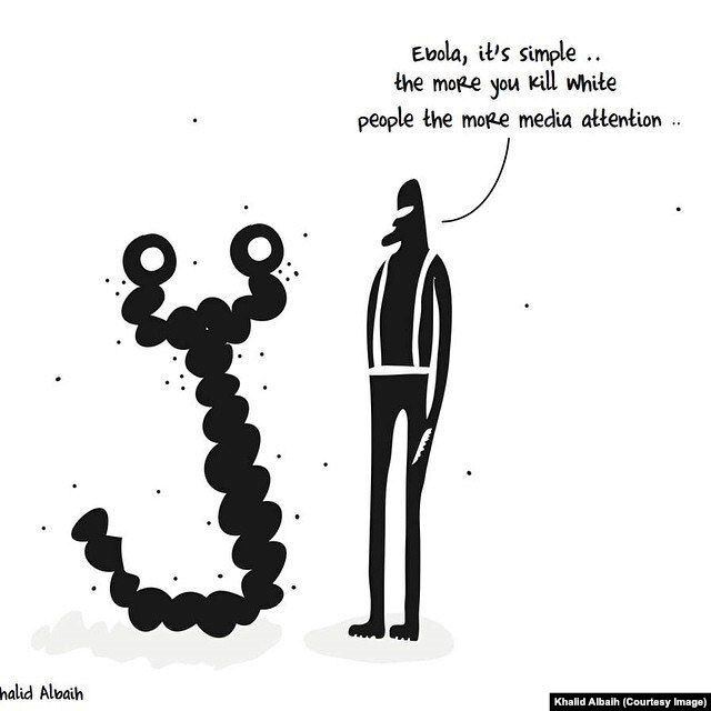 Albaih has poked fun at South Sudanese President Salva Kiir, Sudanese President Omar al-Bashir, and Syria's President Bashar al-Assad in his cartoons. He has depicted Egyptian general-turned-president Abdel Fattah al-Sisi as a pharaoh; shown a fighter from the hard-line Islamic State group, also known as ISIS or ISIL, giving advice on getting media coverage of the Ebola virus; and used his pen to criticize the lack of rights in the Arab world.