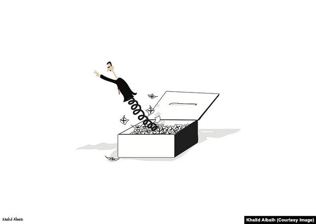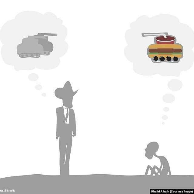 Albaih has been unable to sell his cartoons to politically conservative newspapers in the Middle East where he now lives, so he posts them online. He said that by posting his work on social media, his cartoons spark conversations.