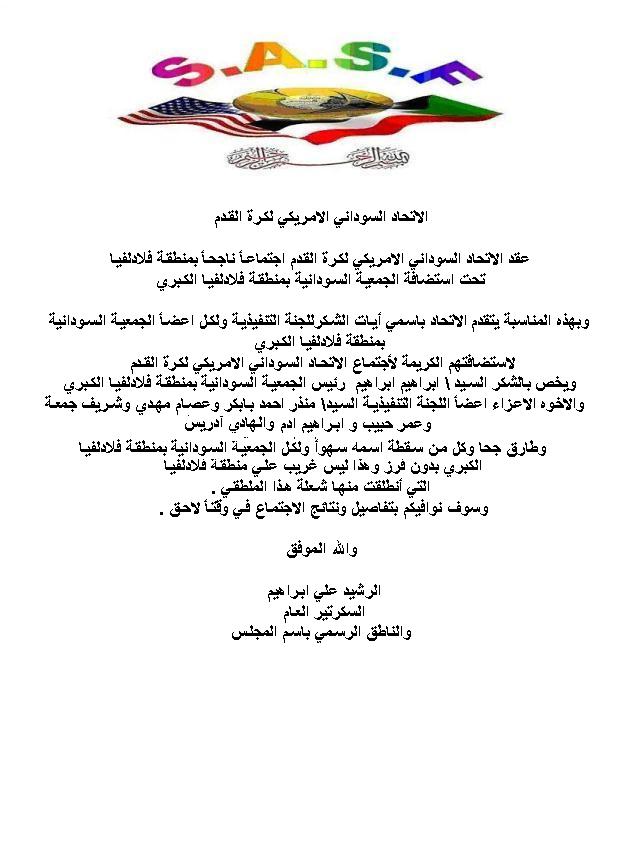 أود فى البدء أن أنقل اليكم اجمل التهاني  بعيد الإستقلال المجيد مع احر الأمنيات للجميع بسنه مكللة  بالنجاح ولإزدهار وان تنعم بلادنا بلإستقرار والسلام أصدق التحايا والتقدير ، والدعوات الصادقات بموفور الصحة ، وتمام العافية ودوام التوفيق والترقى للجميع.  كما أود أن اعلن عن اجتماع لأعضاء اللجنة اللتنفيذية وللأعضاء الممثلين للولايات التي تقدمت بطلباتها لاستضافة اللدوره القادمه,  تحت رعاية وإستضافة ولاية بنسلفانيا- فيلادلفيا. لمناقشة   إختيار الولاية المستضيفة للدوره القادمه و كيفية الإستعداد لها الزمان: 24 يناير 2009 في تمام الساعة 1 بعد ظهر للمزيد من المعلومات الرجاء الإتصال ب الرشيد ابراهيم (السكرتير العام) 1028-568-703 الهادي محمد علي ممثل ولاية بنسلفانيا و(نائب السكرتير العام) 9560-974-267 سوف تكون هنالك اخبار ساره لجميع الفرق الرياضيه أن شاء الله