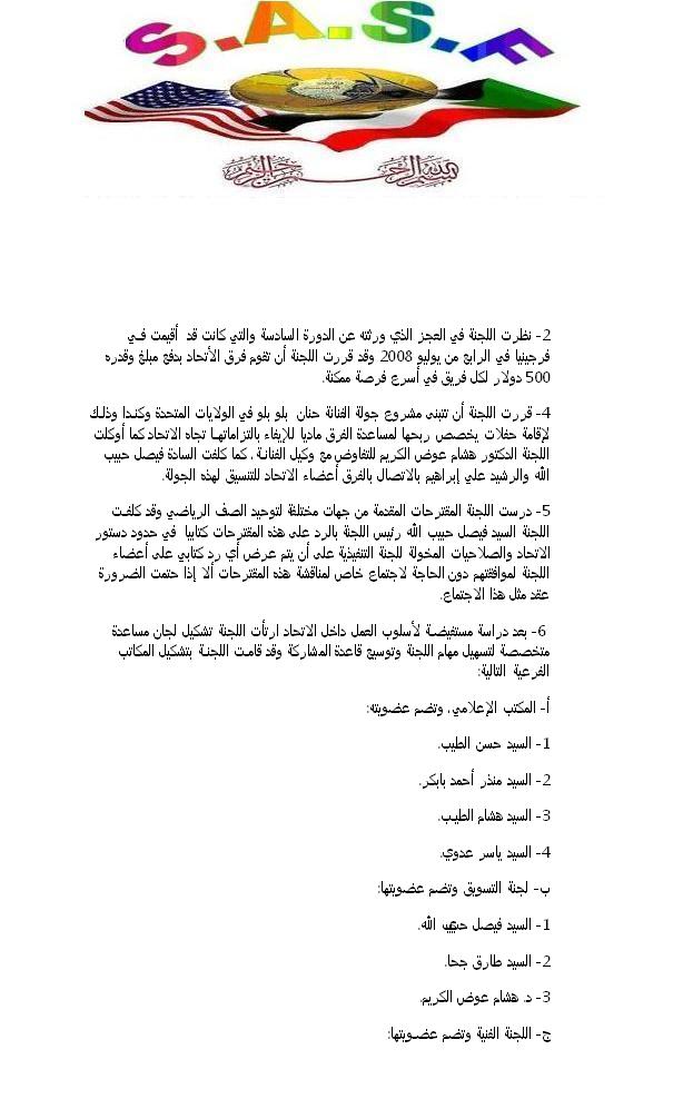 1- نظرت اللجنة في الطلبات المقدمة لاستضافة الدورة السابعة للإتحاد والتي ستقام في يوليو 2009 وقام بدراسة الطلبات المقدمة من فيلادلفيا, فرجينيا وأوهايو. وبعد أن تقدمت فيلادلفيا بسحب طلبها قررت اللجنة بغالبية الأعضاء تكليف فريق ولاية فرجينيا بتنظيم الدورة. كما تم تكليف السادة إبراهيم محمود الحاج والهادي محمد عبد الله بمتابعة ومساعدة لجنة فريق فرجينيا المنظمة للدورة.