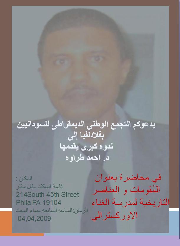 يدعوكم التجمع الوطنى الديمقراطى للسودانيين بفلادلفيا إلى ندوه كبرى يقدمها د. احمد طراوه الباحث في تاريخ ثقافة و غناء السودان في محاضرة غنائية بعنوان المُقومات و العناصر التاريخية لمدرسة الغناء الاوركسترالي الثانية تتضمن المحاضرة سرد و تحليل تاريخي لعوامل نشأة و تطور فن الغناء السوداني مدعوم بنماذج غنائية واسعة و متنوعة