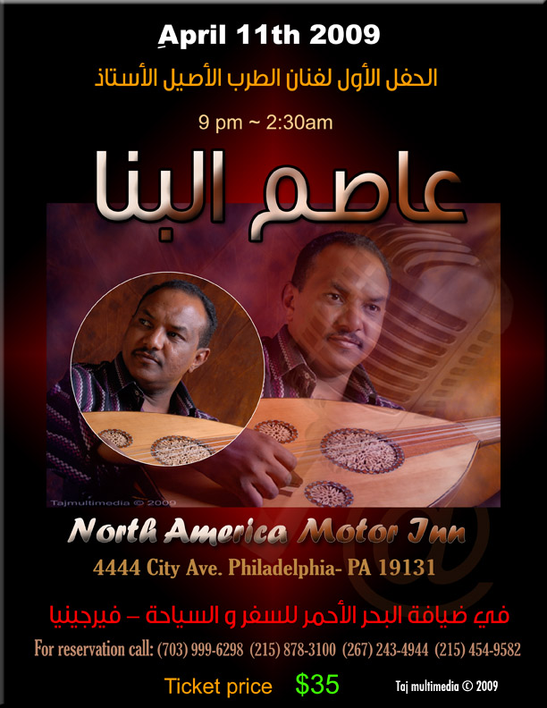 فلاديلفيا و نحن مدعون للفرح و البهجة مع أنغام و إبداع الفنان عاصم البنا يوم السبت الموافق 11 أبريل كما معلن عنه . هذا الفنان غنيٌ عن التعريف ويكفي أنه سليل أسرة البنا العريقة و المعروفة علي إمتداد سوداننا الحبيب . ولد في بيوت هي كالقلب في صناعة ووجود وغناء شعر الحقيبة . أصّر علي الغناء رغم المعارضة ! و أجاد فيه . إنسان مرهف مفعم بحب السودان و شعره و غناؤه . نحن في شركة البحر الأحمر نفتخر بإستقبالنا للفنان عاصم البنا و نعتز بأننا نعد له برنامج يشمل العديد من الولايات كما لا تخلو زيارة الفنان عاصم البنا من الجوانب الإجتماعية . و بالتعاون الجاد المثمر بين شركة البحر الأحمر و إحدي المنظمات الطوعية الخيرية , إسم هذه المنظمة " جينا " . منظمة جينا تعمل في مجال إرسال البعثات الطبية للسودان خاصة مناطق جبال النوبة و دارفور إضافة لنشاطات متعددة مع مركز المايقوما لرعاية الأطفال . لمزيد من المعلومات عن منظمة جينا الطوعية يرجي الرجوع الي الصفحة الإلكترونية www.genafoundation.org