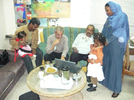صورة توثيقية الفنانان البحرينيان راشد العريفي وأنس الشيخ يتوسطان الاستاذة عايدة وزوجها الاخ الزميل عبدالله وكانا يشاهدان الاعمال افنية على جهاز (اللاب توب).. وقد أعجبابها كثيراًً
