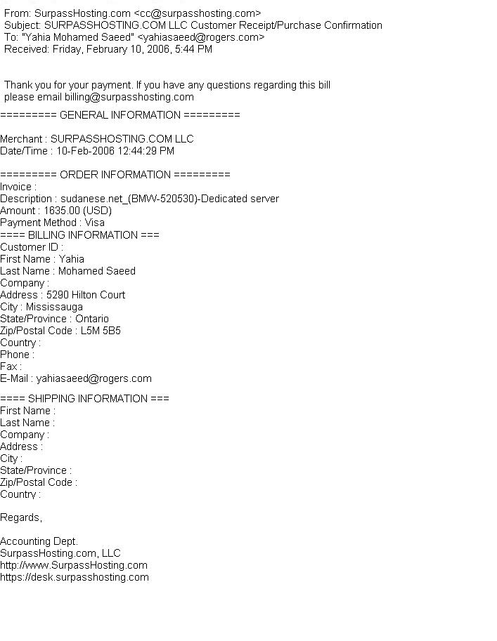 اما عن المستند الذى أنزلته: وهو مداخلة لقبانى بالموقع القديم:اولاً أنوه أنه من السهل على أى إدارى بموقعكم تعديل المداخلة، فهى مستند منقوص. ثانياً لنفرض صحتها (وهذا ما أرجوه). لا أدرى ماهو الجديد من معلومات هنا وكانه مستند خطير مفحم يتسأل بعضكم أين تعليقى عليه؟ فالمستند فيه نقطتين: (1) أن مالك الموقع طارق هاشم ، (2) شفافيه كلمات يحيى قبانى وهو يغادر الموقع. معروف أن العلاقة تعدت مرحلةالصداقة والإتفاقات الأخوية الغير موثقة رسمياً، وأصبح الأمر أوضاع رسمية قانونية. وهذا ما عكسته كلمات يحيى بأن مالك الموقع طارق هاشم. فراعى الدومينات فى الخلاء الإسفيرى يدرى تماماً أن من مسجل بإسمه الدومين فهو قانوناً مالك الموقع (Sudanese.net )، كما يدرى أن من مسجل بإسمه السيرفر (يحيى) هو المالك القانونى له. اما غير ذلك من مجهودات خرافية أو أموال بذلت فى إدارة الموقع وتكاليفه من قبل الإداراة والأعضاء لا تعط حقاً. وجاءت عبارات يحيى رسمية مهنية إحترافية واعية ـ يحيى إدارى (فذ) متميز!