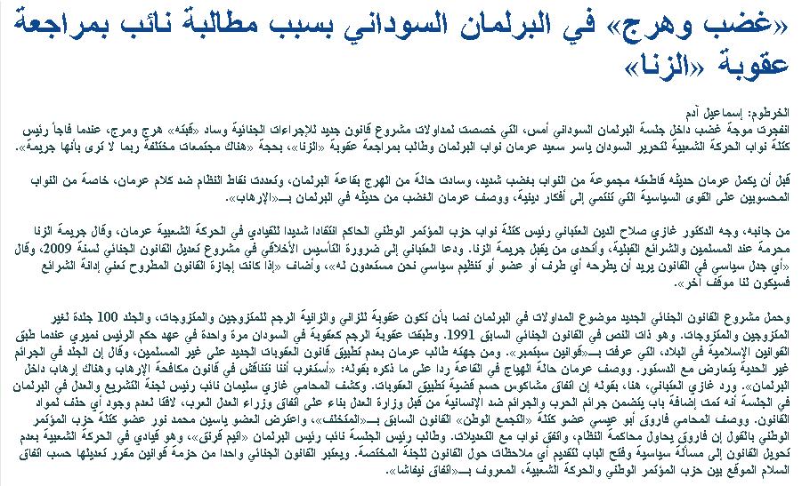اولا يجب نميز بين الرفض الاخلاقى المتفق عليه بين جميع السودانين لهذا السلوك وبين طلب تحديد المرجعيه الاسلاميه(رغم تحفظى على اعتبار الصياغه اسلاميه)كمرجعبه وحيده لمعالجه الزنا وبالتالى فرض الياتها للتعامل مع هذا السلوك على غير المسلمين