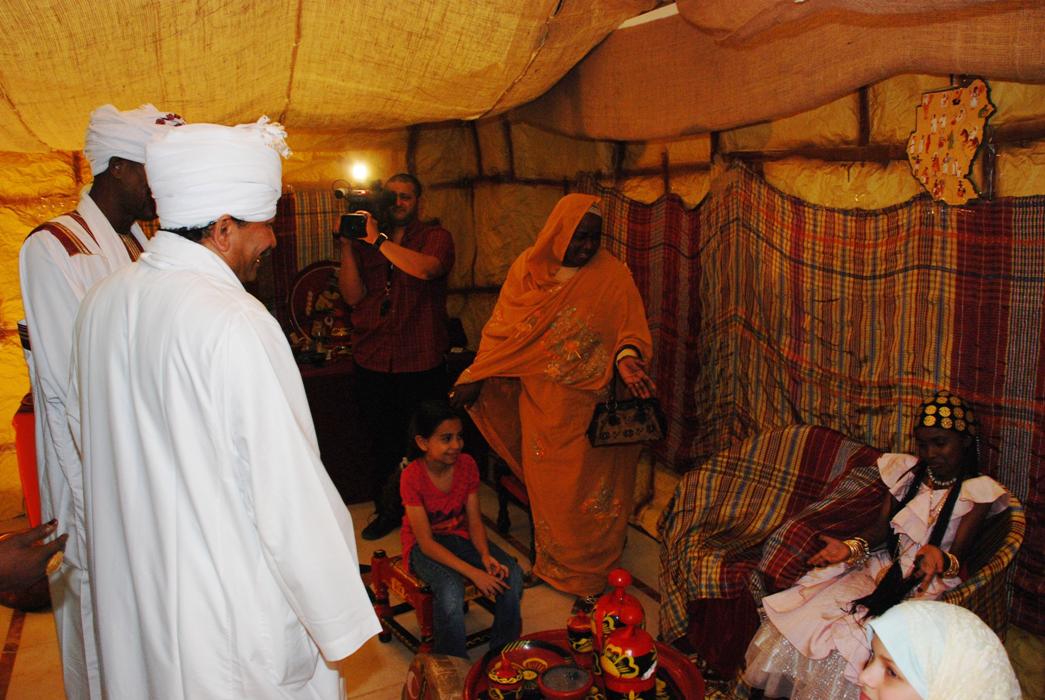 في البدء قابلني معرض تراثي انيق ومبسط ضمت جنباته امزجه سودانية من زوايا الوطن الاربعة تتوسطه طفل وطفلة يبشر هندانهما باجواء الفرح والسباته.