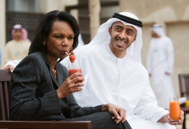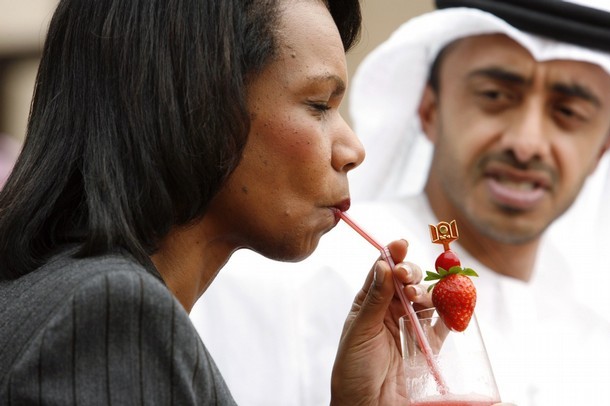 قصة كوانداليزا رايس وعصير الفراولة الإماراتي كوندوليزا رايس اثناء زيارتها للإمارت محتارة إيش تشرب وأخيرا اختارت عصير الفراوله