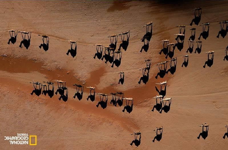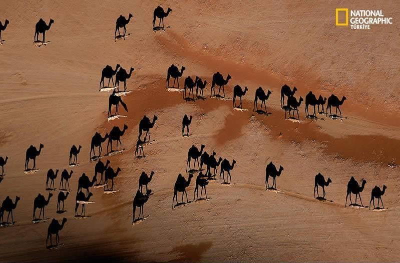 الصورة المعروضة صورت عصرا وتكمن حيلتها في تكثيف ظل الجمال بحيث يصبح الظل هو الموضوع بدلا عن الشئ الذي يلقي بظله على أرض الصحراء التي تفعل هنا فعل الكانفاس في (التلوين) لتضيف الى دراما المشهد وتميزه.
