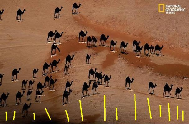 الصورة مأخوذة من أعلى ويظهر لون الجمال باللون الأبيض وأما اللون الأسود ماهو إلا ظل للجمآل 'دقق بالصورة ' يعني ما تراه أمامك هو ظلال للجمال.. اما الجمال الحقيقية فهي البقع البيضاء....