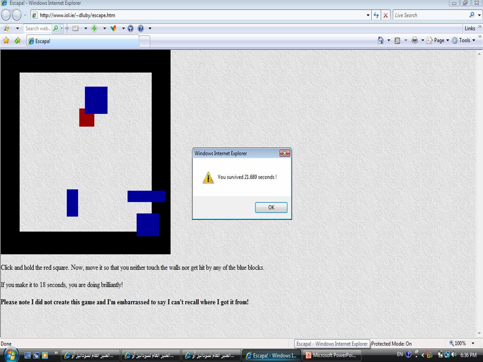 اللعبة ظريفة بس المبرمج نسى يكتب فى الكود ....عند الضغط على زر الماوس الأيمن أوقف العد الزمنى...
