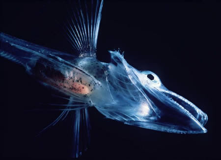 This bizarre deep-water fish called the Barreleye (Macropinna microstoma) has a transparent head and tubular eyes. It has extremely light-sensitive eyes that can rotate within his transparent, fluid-filled shield on its head, while the fish's tubular eyes, well inside the head, are capped by bright green lenses. The eyes point upward (as shown here) when the fish is looking for food overhead. They point forward when the fish is feeding. The two spots above the fish's mouth are not eyes: those are olfactory organs called nares, which are analogous to human nostrils. (Photo by MBARI)