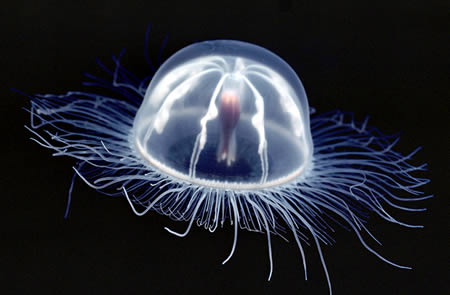 Jellyfish are free-swimming members of the phylum Cnidaria. They are found in every ocean, from the surface to the deep sea. Many jellies are so transparent that they are almost impossible to see. The one above is from the Arctapodema genus, with a size of an inch-long (2.5-centimeter- long). (Photo by Bill Curtsinger)