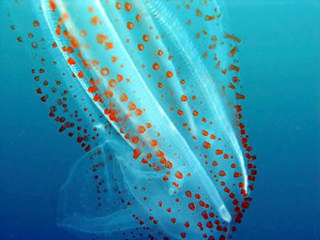 This jellyfish-like animals known as Salps feed on small plants in the water called phytoplankton (marine algae). They are transparent, barrel-shaped animals that can range from one to 10cm in length. (Photo by DM)
