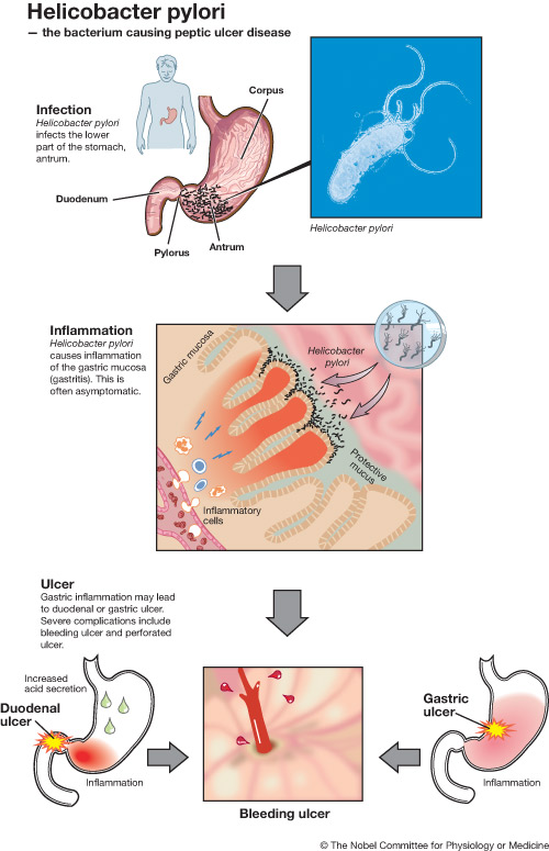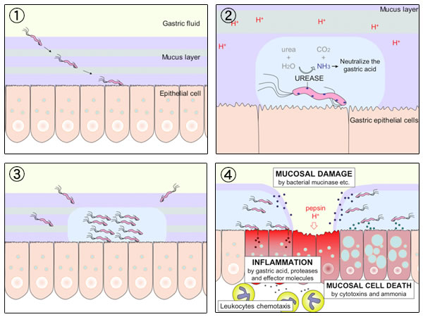 شكل البكتيريا ومكان تواجدها بالمعدة ولكن تلك البكتيريا عند خروجها من الفم تكون ضاره بدرجة كفيلة أن تقتل ذلك الإنسان في بعض الأحيان وأن تصيبه بمرض خطير في أحيان أخرى. تقوم تلك البكتيريا عندما تخرج من الفم بواسطة النفخ بالتحوصل على الطعام الساخن حيث أن البكتيريا كائنات حساسة للحرارة فتقوم بحماية نفسها بالتحوصل ثم يتناول الإنسان ذلك الطعام حيث تتواجد البكتيريا فيه بشكل كبير جدا وتكون في أتم الاستعداد للدخول إلى داخل الجسم، تخيل كم مرة يقوم الإنسان بالنفخ في ذلك الطعام وكم هي كمية البكتيريا المتواجدة فيه! ثم يقوم الإنسان بتناول ذلك الطعام مع تلك البكتيريا المتحوصلة. تبدأ الرحلة من الفم ومن ثم المرئ إلى أن تصل إلى المعدة فتقوم تلك البكتيريا بالتنشيط و إفراز انزيم اليوريا Urease enzyme الذي يسبب التهاب الأغشية المبطنة للمعدة مسببا بذلك خرقا في الجدار حيث تبدأ المعدة بهضم نفسها وحدوث تآكل بجدار المعدة مما يؤدي إلى هضم المعدة لنفسها. آلية عمل البكتيريا وحدوث القرحة داخل المعدة أيضا تسبب تلك البكتيريا ضعفا في إفراز الأنسولين بالبنكرياس مما يؤدي إلى ارتفاع نسبة السكر بالدم وحدوث مرض السكري. وكما يقول المثل العربي بأن الوقاية خير من العلاج فإن الوقاية من ذلك كله تتمثل في الحفاظ على نظافة الفم واستعمال السواك أو الفرشاة والمعجون أو حتى المضمضة كما يحدث عند الوضوء. عافانا الله وإياكم