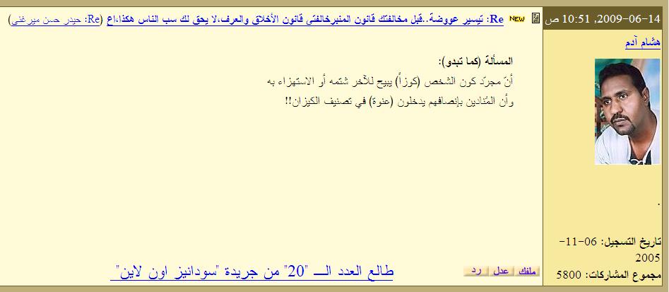 Re: الأديب والمثقف (هشام آدم) يقول : أنّ مجرّد كون الشخص (كوزاً) يبيح للآخر شتمه أو الاستهزاء ب (Re: Mohammed Haroun)