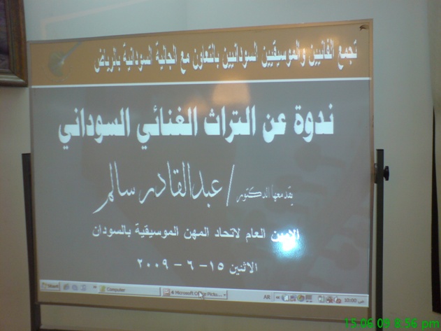 ندوة عن التراث الغنائي السوداني حيث قدم فيها الدكتور عبدالقادر سالم ندوة جميله جدا جدا وكانت في النادي الادبي السعودي بالرياض اليوم الاثنين 15/06/2009 وقدم فيها الدكتور مختلف اللون الغناء في جميع قبائل السودان ... وامتازت الندوه بتنوع الجنسيات و التي تهتم بالفن من الجنسيات السعودية وبعض الحضور من الجنسيات المصرية وكان الحضور مشرفا جدا حيث تفاعل جميع الحضور مع الدكتور عبدالقادر سالم في هذه الندوه المفيده ومن هنا اشكر تجمع الفنانين ولا انسى ايضا الشكر الموصول الى الاستاذ الصحفي الفاضل هواري الذي نظم لنا هذه الامسية مع النادي الادبي السعودي في مدينة الرياض