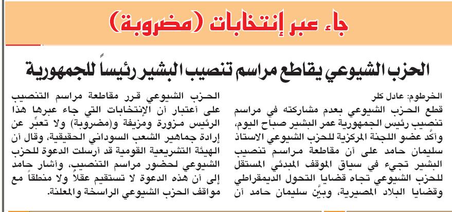 Re: الحزب الشيوعي .. يقاطع مراسم تنصيب (البشير) رئيسا للجمهورية . (Re: ماضي ابو العزائم)