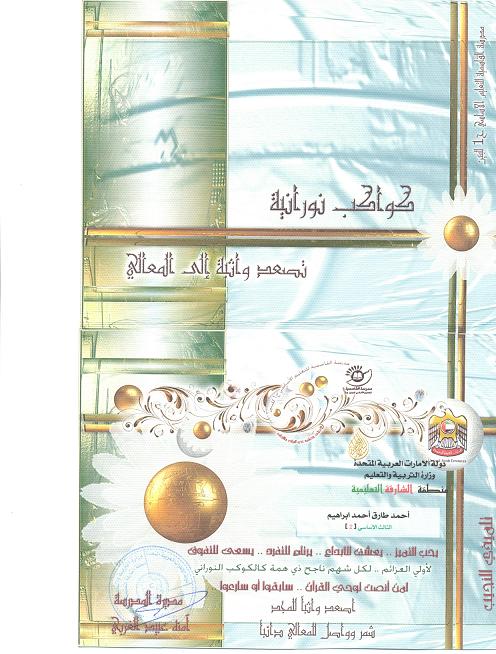 |  Re: عفاف الصادق بابكر  مبروووووووووك (Re: محمد علي شقدي) |  | الخرطوم: الرأي العام كرمت ادارة مدرسة القاسمية بالشارقة الطالب السوداني «أحمد طارق احمد ابراهيم» بوسام شرف، بعد أن تفوق في النتائج النهائية وأحرز المرتبة الأولى متقدماً على اقرانه الاماراتيين والطلاب من الجنسيات المختلفة.. ويقول والد الطالب «طارق احمد ابراهيم» أن نجاح ابنه وتكريمه من قبل ادارة المدرسة هو تكريم لكل السودانيين وشهادة على تفردهم ونبوغهم في كل دول العالم، ويضيف أنه اصيب بالحسرة لعدم تمكنه من حضور التكريم وذلك لوجوده بالسودان.. الجدير بالذكر أن الطالب المتفوق يدرس بالصف الرابع الابتدائي وهو ما قد ينبيئ باحتكاره لمراكز متقدمة في بقية المراحل الدراسية القادمة..