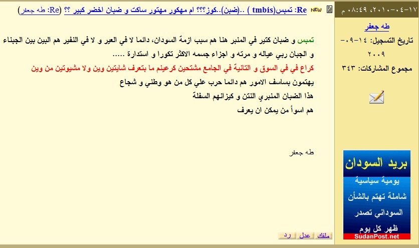 ساقوم بإدراج كل مداخلاتك التي تدل على أنك مناضل كيبوردي .. فاحش اللسان لا تقدر على المجابهة .. إنما تكتب في ظروف خاصة جدا .. وستجد هنا مداخلتك واعتذارك الذي كتبته هنا .. وعدت من جديد عشان تقل ادبك علي بي اسم الكفاح والنضال الكيبوردي .. يا طـه جعفر انا قلت ليك زمان خليتك عشان الناس الدخلو في النص بيناتنا .. لكن تاني جيت اتدرعتني براك .. عشان كدا إن شاء الله ح نرجع للمربع الأولاني .. عشان يا بقيت مناضل كيبوردي زيك .. يا إنت خليت النضال بيتاع الكيبورد دا .. ودخلتني في القائمة الفوقانية دي