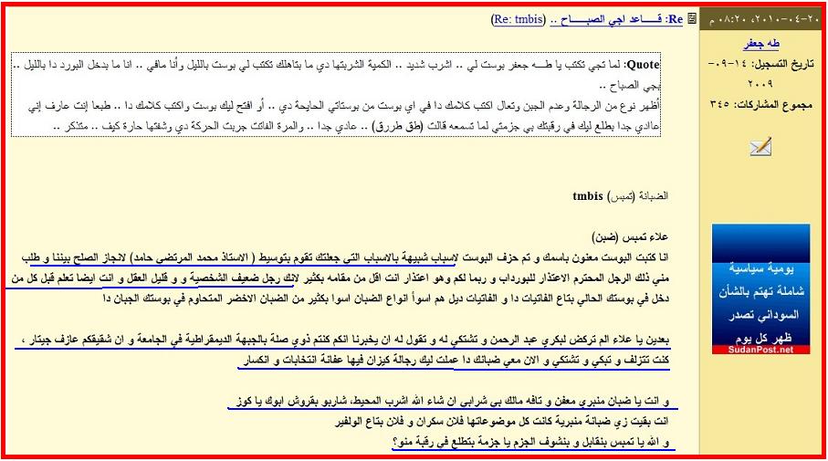 طبعا هذا العبدالمنعم معروف بانو احد الغواصات الانقاذية وهو - بعد ان كشفناه - اصبح لا يفوت استثمار فرصة او نصف الفرصة من اثبات عكس ذلك ... وذلك بالاصطياد في مثل هذا البوست طلباً لشهادات الخبرة النضالية هنا او في اي منحنى من منحنيات هذا الاسفير . وهو احسن زول هنا يسب الدين وكريم المعتقدات وصاحب اكبر ذخيرة للسباب والشتائم والصاق التهم الباطلة بالزملاء (يمكنك مراجعة مداخلته هنا في رده على الزميل كانتونا-1 ) وهذا فضلا عن استخدامه للعنف اللفظي مع زميلات المنبر وهذه بعض الامثلة : 1/ وصف زميلة هنا بانها لبوة 2/ واخرى بانها من قوم لوط 3/ قال لاسكات صوت احدى الزميلات (هل انت مطهرة) 4/ اتهم الاخت الفاضلة ماجدة خوجلي بانها امنجية 5/ اتهم احدى زميلاته باجراس الحرية بانها امنجية بعد ان رفضت (.....) والكثير مما لا يتسع المجال هنا لذكره ولكن الطامة الكبرى (انظر الصورة ادناه)