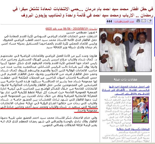 علمت قوون ان اتفاقا سريا قد تم في حفل الافطار الذي اقامه القطب الرياضي محمد سيد احمد امس بمنزله بام درمان والذي ضم عددا من الشخصيات الرياضية واعضاء الاتحاد العام للكرة في ان يترشح الدكتور كمال شداد في قائمة موحدة تضم ابناءه بالاتحاد السابق د معتصم جعفر ومجدي شمس الدين واسامة عطا المنان وذلك بعد ان برز اتجاه قوي لعودة المياه الي مجاريها بين البروف شداد وابنائه بالاتحاد السابق من خلال اجتماع مشترك يتم في الساعات القادمة لاحتواء الخلافات بينهم والتي اعتبرها الكثيرون انها خلافات عادية ويمكن ان تزول ويعود الاتحاد السابق برئاسة شداد لقيادة الكرة في المرحلة المقبلة. المصدر: جريده قووون http://goansport.net/article/id/34408