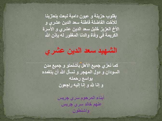 رحمك الله يا سعدالدين عشرى وأنت فى عليائه ،، رحمك الله ودعوات أناسك الصادقات معك ،، رحمك الله وثواب من أعنتهم بنفسك وبمالك وموقعك وعلاقاتك يدثرك ،، رحمك الله يا الرجل الهاشى الباشى ،،