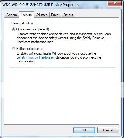1- و ضع الهارد ديسك الخارجي على الوضع الافتراضي الامثل للازالة السريعة و عدم تغييره وذلك لأنك لا تدري متى ينفصل السلك او تنقطع الكهرباء عن الهارد ديسك و هذا يؤثر فيه سلبا ولعمل ذلك نقوم بالتالي:- حدد على الهارد ديسك الخارجي المطلوب و اختاره و اضغط بزر الماوس الايمن و اختار خصائص properties