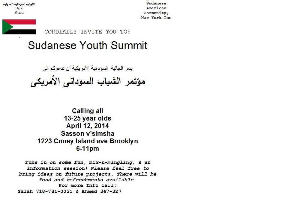 الجالية السودانية الأمريكية ينيويوؤك تدعوكم الى مؤتمر الشباب السودانى-السبت 11 أبريل ببروكلين