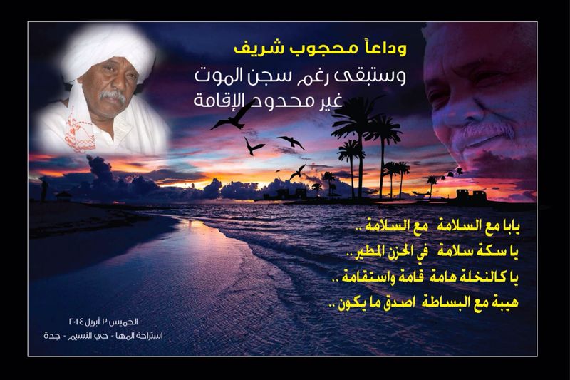 |  الكيانات الوطنية بجدة تتقبل العزاء اليوم (وداعا محجوبنا ) |  | الكيانات الوطنية والفعاليات الثقافية والاجتماعية والرياضية بجده تنعي للشعب السوداني الكريم وكافة ابناء الوطن بالخارج والداخل ، شاعر الشعب ( محجوب محمد شريف ) وتقيم عزاء اليوم الخميس باستراحة المها بحي النسيم وذلك عقب صلاة العصر وحتى الساعة التانية عشر ليلاً