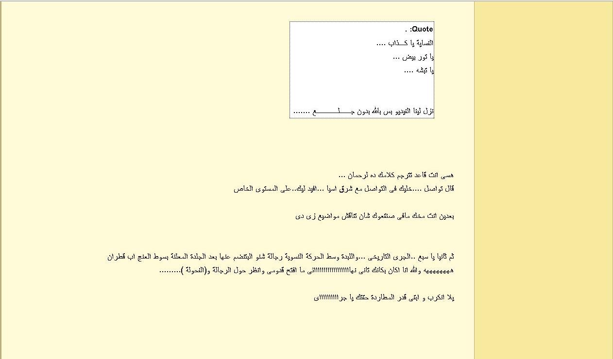 Quote: ماعايز اى نصيحة حول ردى لهذا المعتوه ..ابو العفين كبشرات ...او ابوالحسين الجراى اللبد وسط الحركة النسوية فى حفلة طارق ابوعبيدة الجرية التى اصبحت تاريخ يؤرخ به ل احداث عديدة ..... |