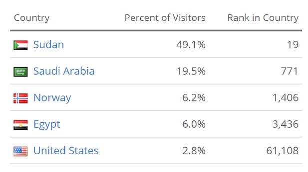 ذكر أكبر مواقع الإحصاء أن السودانيين يتصدرون الدول العربية والعالمية لزيارة المنتديات وحسبما هو ظاهر بالصورة أن السودان باللون الأخضر الداكن بنسبة 46% من المشاهدين
