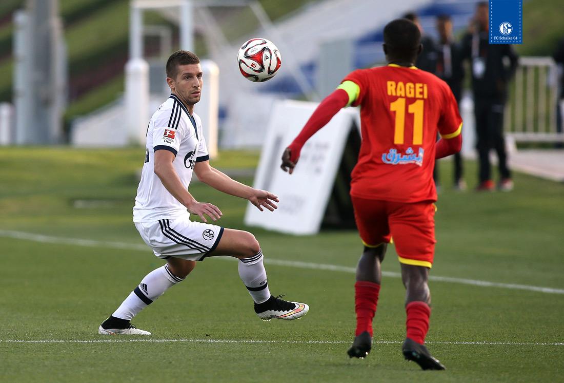 كابتن المريخ راجي في صراع على الكرة مع لاعب من شالكا