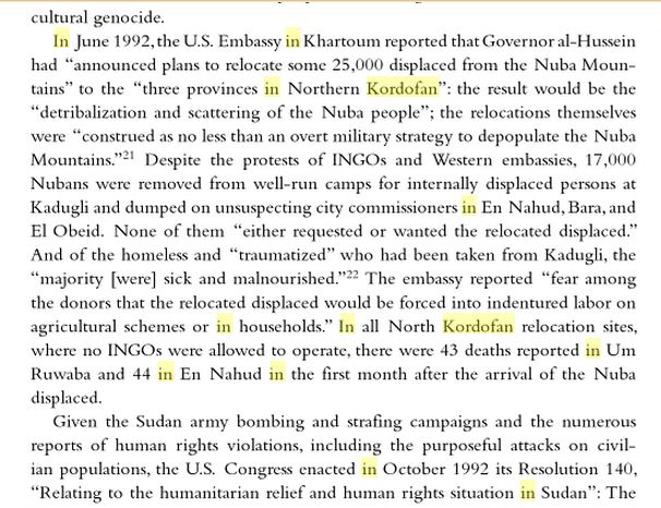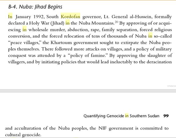 „Do the Crimes against the Nuba warrant the Term “Genocide”? They certainly fit the legal definition contained in the 1984 Genocide Convention, and if the Sudan Government is able to pursue its programme unhindered for one or two more years, many thousands of Nuba people will have been killed, the majority of women and girls raped, and children separated from their parents and subjugated to forcible change of identity, in addition to the tens of thousands who will have perished in the Nuba people will no longer exist in a recognizable state. They will be politically subjugated and socially dismembered with their distinctive cultures obliterated.