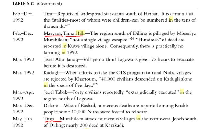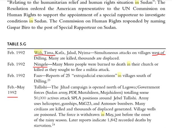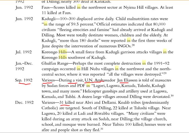 ((ثم اقتحمت فرق المشاة القرى وهي تطلق الرصاص دون تمييز فتقتل مئات المدنيين، وكان الشبّان ـ إذا وجدوا في القرى ـ غالبا ما يُعدمون فوراً. أما الذين ظلوا في القرى، وكان معظمهم من النساء والأطفال والكهول، فقد جمعوا ونقلوا بالشاحنات المكشوفة إلى كادوقلي ... وغرض العسكريين هو إخلاء المنطقة كلها لأنهم يخشون أن ينضم القرويون "للجيش الشعبي لتحرير السودان)).