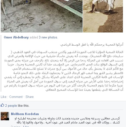وعندما علم السيد أشرف سيد أحمد الحسين (الكاردينال ) رئيس مجلس ادارة نادي الهلال بالأمر التقط القفاز وقام بالتوجيه بإدخاله المستشفى للعلاج متكفلاً بنفقات علاجه كاملةً ,جئنا أمس الأول للمستشفى ولكنه رفض البقاء مصراً على الذهاب للمنزل وبالفعل وعملاً بنصيحة الأستاذ كمال افرو سمحنا له بالذهاب للمنزل وأخذناه للمنزل وفي الصباح وبمعاونة الدكتور السفير علي قاقارين والكابتن محمد عبدالـلـه مازدا المدير الفني لمنتخبنا الوطني والدكتور عمر النقي إضافةً للبروفيسور معاوية الدرديري تم إقناعه بالعودة للمستشفى لتلقي العلاج وها هو الان يتلقى العلاج بمستشفى النيل الأزرق.