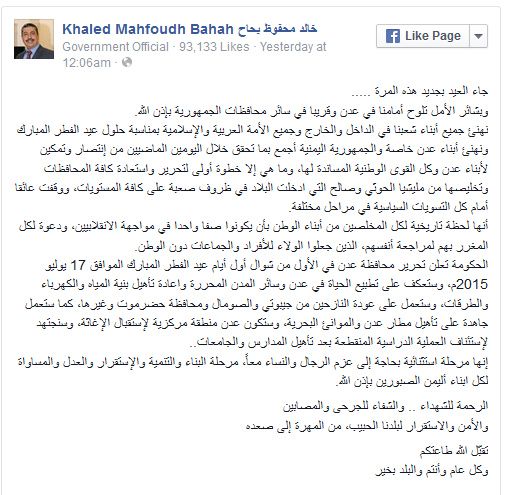 وقد تم الإعلان عن تحرير محافظة عدن رسمياً من الحكومة اليمنية بقيادة الرئيس اليمني عبده ربه منصور ..