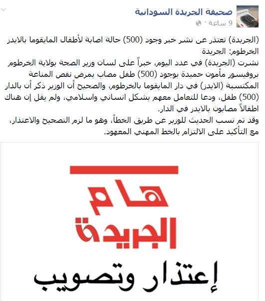 Quote: (الجريدة) تعتذر عن نشر خبر وجود (500) حالة اصابة لأطفال المايقوما بالايدز الخرطوم: الجريدة نشرت (الجريدة) في عدد اليوم، خبراً على لسان وزير الصحة بولاية الخرطوم بروفيسور مأمون حميدة بوجود (500) طفل مصاب بمرض نقص المناعة المكتسبة (الايدز) في دار المايقوما بالخرطوم، والصحيح أن الوزير ذكر أن بالدار (500) طفل، ودعا للتعامل معهم بشكل انساني واسلامي، ولم يقل إن هناك اطفالاً مصابون بالايدز في الدار. وقد تم نسب الحديث للوزير عن طريق الخطأ، وهو ما لزم التصحيح والاعتذار، مع التأكيد على الالتزام بالخط المهني المعهود.