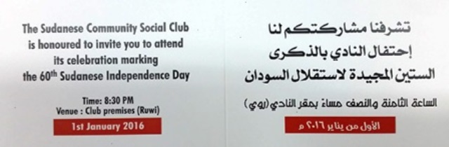 إحتفل النادى السودان بمسقط أمسية الجمعة 1 يناير 2016 بذكرى الاستقلال حضر الاحتفال عدد كبير من أبناء الجالية المقيمين بالسلطنة , قدم كورال شباب النادى والفرقة الموسيقية مجموعة مختارة من الاناشيد والاغانى الوطنية