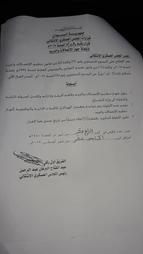 يبدو انو القرار صحيح حتي اللحظة تبعية الاتصالات والتقنية لوزارة الدفاع
