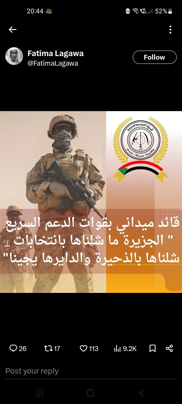 Quote: Fatima Lagawa @FatimaLagawa · 7h نتاسف للخطأ في عدد السيارات المستلم وردنا الان من الميدان: عدد السيارات المستلمة 75 عربية بكامل عتادها الحربي وحرق دبابة واستلام ثلاثة دبابات حية✌🏿✌🏿✌🏿 قوات الدعم السريع تسحق مليشيات كتائب البراء ومرتزقة تمبور ومناوي وجبريل وعصابة