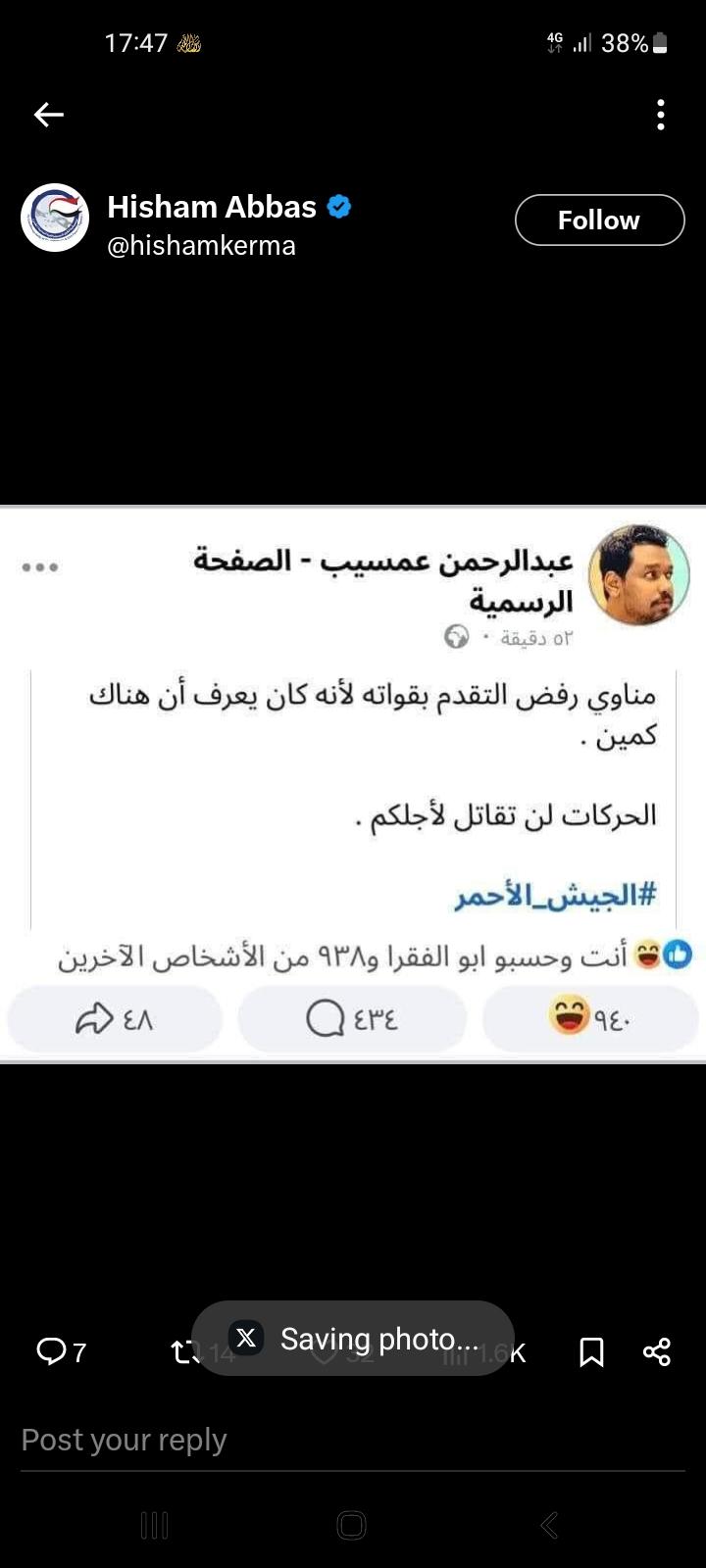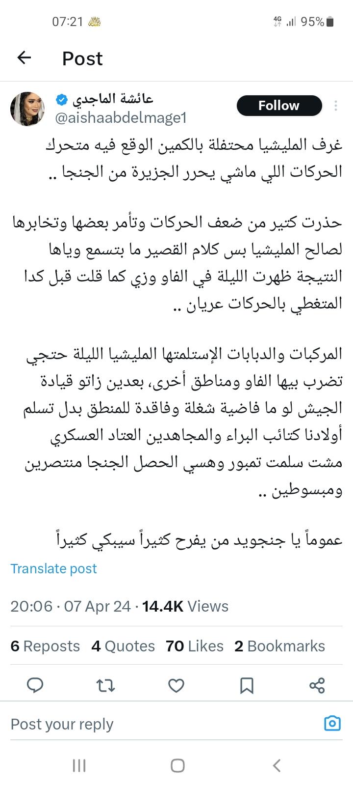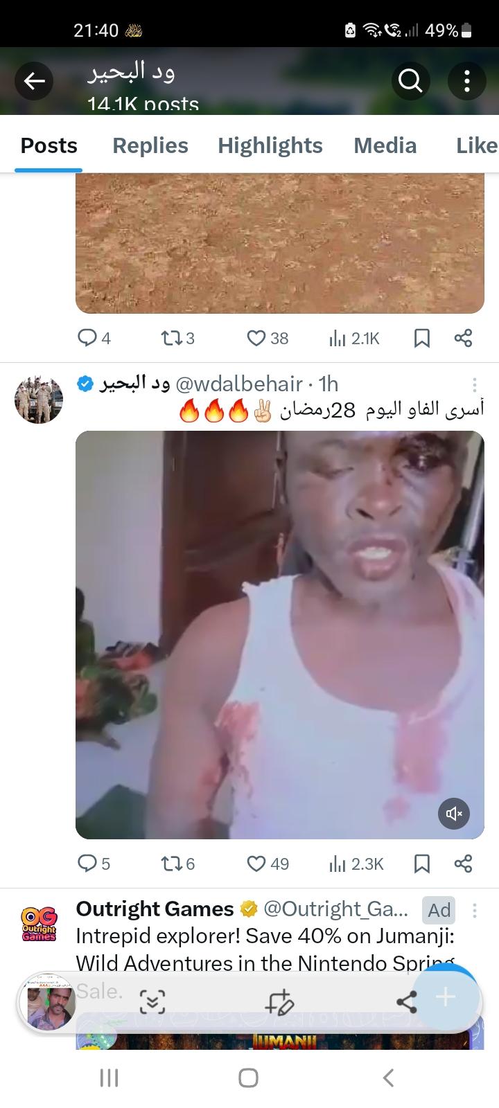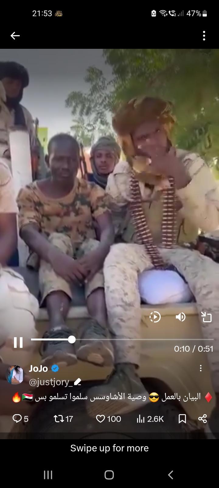 دا مصدرك؟ اذن والله يا محمود يا اخوي كده بخجل ليك عندنا في الاعلام كقاعدة ثابته هي مصداقية المصدر هل انت شايف انو التويتر او الفيسبوك مصادر يعتمد عليها ؟ تكون بالغتا والله يعني انا ممكن اديك هنت ممكن انزل ليك فيديو من اليوتيوب و اغير احداثيات الفيديو دا بطريقة بعرفا انا وارجع انزلو تاني سواء كان في اليوتيوب او التكتك اوتويتر و يكون بتاريخ اليوم والساعة وفي الحقيقة يكون الفيديو دا كان في بدية الحرب..والله صحي لكن انا بخاف ربنا وبحترم نفسي ومصداقيتي فيا اخي خاف الله في الناس ربنا يرضى عليكم وما افة الاخبار الا رواتها محمود يا اخوي لاتكن من افه الاخبار مثل مايفعل هذا الخنزير البري برمة المريسة البعلف من النت بعدين الواحد وللمصداقية مفروض يجيب الفيديو كامل مسالة انو الناس تعلف اسكرين شوت دا موضوع مستحمي بليفة سلك مافي حاجة اسمها مراعاة مشاعر الناس الناس بموتو يا اخوي مشاعر شنو تاني قال الشاعر : اعطيتهم نصحي بمنعرج اللوى فلم يستبينوا النصح الا ضحى الغد عظيم تحياتي