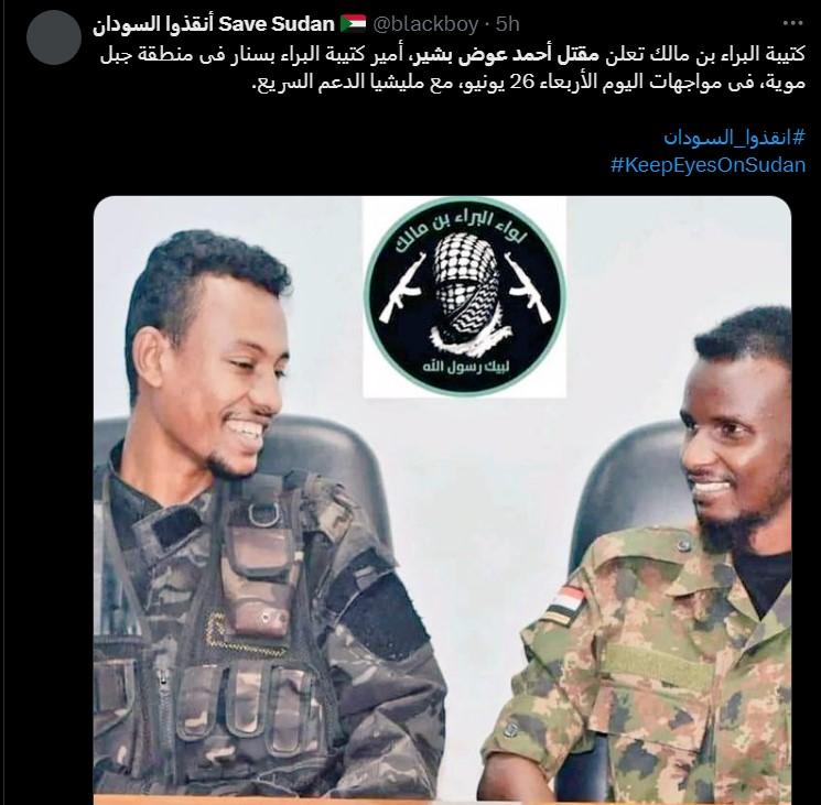 وعزت حسابات تابعة لمليشيا الأخوان كتيبة البراء بن مالك في موت قائدها بمنطقة سنار