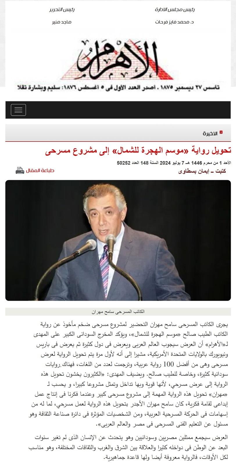 تحويل "موسم الهجرة إلى الشمال" إلى مشروع مسرحى
