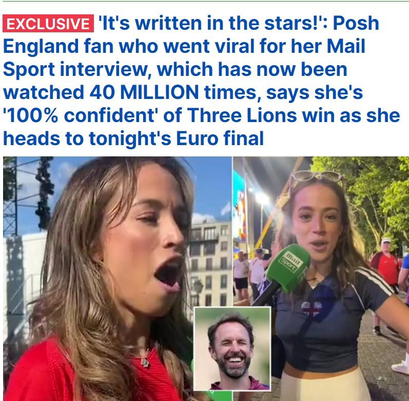 بت المحظوظة المشجعة الإنجليزية ، جولي شارب ، 22 عاماً ، قالت إنها "واثقة بنسبة 100٪" من فوز الـ Three Lions الليلة. تمت مشاهدة الفيديو أكثر من 40 مليون مرة بعد أن سُئلت عن آرائها حول المدير الفني جاريث ساوثجيت أثناء خروجها من الملعب في دورتموند بعد فوز الأسود الثلاثة على هولندا في نصف النهائي . أثارت تعليقاتها الإيجابية عن ساوثجيت ، التي أثنت فيها عليه وطلبت منه "تجاهل الكارهين" ، موجة من الحب والإعجاب عبر منصات التواصل الإجتماعي، بعد أن واجه موجة من الإنتقادات منذ بداية البطولة للأداء غير المقنع للمنتخب ، وعدم توقع الكثيرين وصوله للنهائي. المشجعة قالت انها تتوقع أن يحرز بيلينجهام هدف الفوز . منذ أن انتشرت مقابلتها، إرتفع عدد متابعيها على Instagram وحده من ستة آلاف إلى 40 ألفاً. - لكن كده يا بت الناس ما جغمتينا