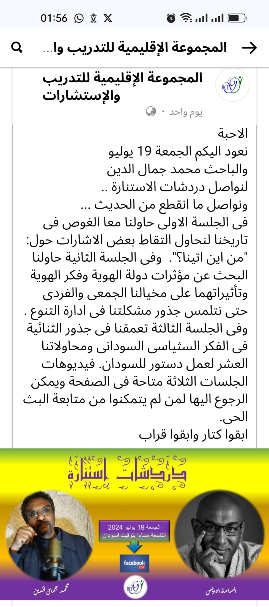 ندوة الجمعة 19 يوليو 2024 (يوم أمس) عن التناقضات المحتملة في مخيال الزول السوداني.. أتمنى الرابط يعمل في منبر سودلنيزأونلاين وإلا فهي موجودة على الزوم وعلى صفحة الجمعية الأقليمية للتدريب والإستشارات وبرضو فيشير على صفحتي في الفيسبوك.. لمن شاء وأتسق الأمر مع بعض إهتماماته. ولقدام ح أنشرها في قناة حضارة السودان.. عندنا كل جمعة حاجة إسمها (دردشة) زي دي مفتوحة للجميع.