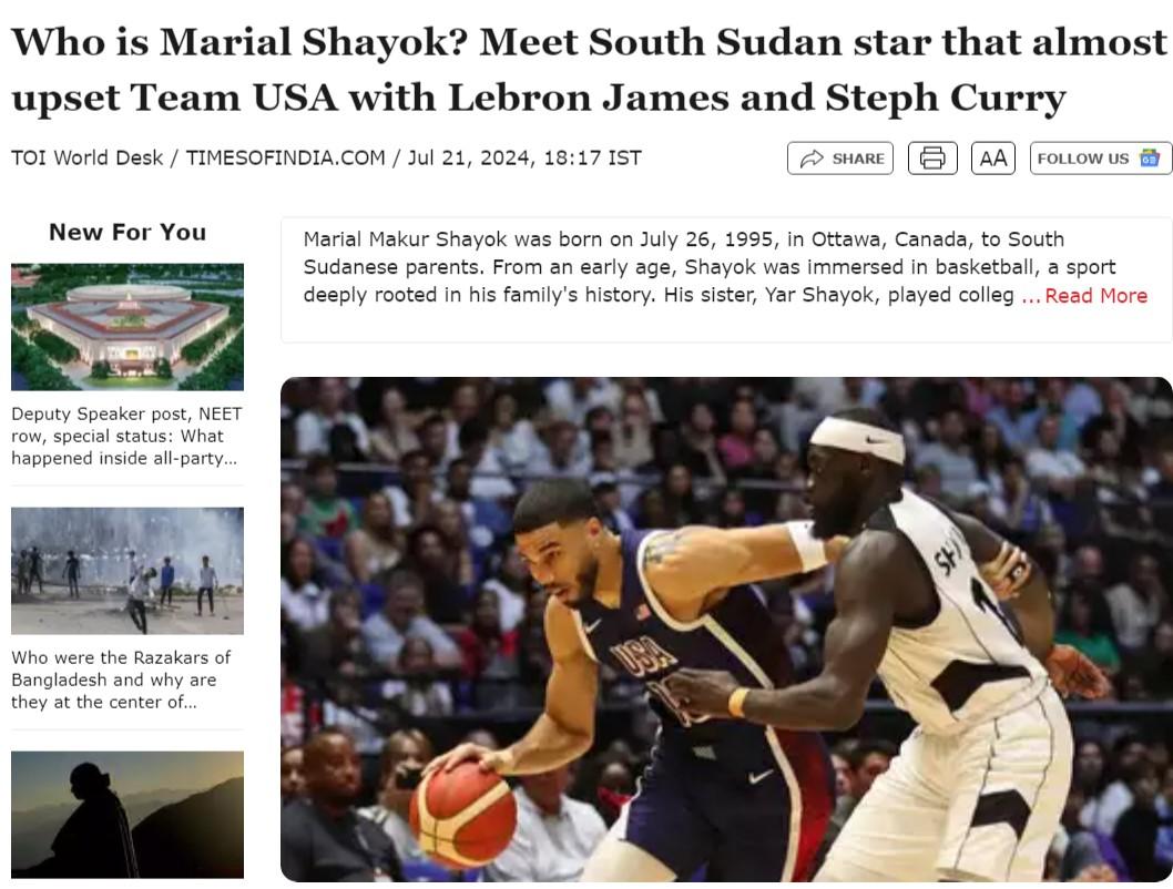 اللاعب Marial Shayok أيضاً برع في مباراة أمس وأزعج منتخب امريكا بتحركاته الذكية رصيده في مبارة امس 25 نقطة، أظهر قدرته على المنافسة على أعلى مستوى ولفت الانتباه إلى المواهب المزدهرة في كرة السلة في بلاده. كان لقيادته وأدائه دور فعال في صعود نجم منتخب جنوب السودان في كرة السلة الدولية.