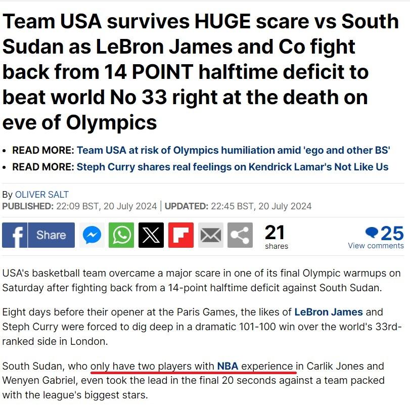 يا سلام يا دينق انك جلبت المقابلة بتاعة الفلنقاي بول بيرس ود اللذينا إضطر لتقديم اعتذار لمنتخب جنوب السودان بعد تعليقه السلبي قبل المباراة تصريحات المتعالية قبل المباراة اللي استخف فيها بقدرات منتخب جنوب السودان خلتو يبلع كلامه تخيل انه توقع فوز سهل لمنتخبهم بفارق 30 نقطة بعد المباراة، جرى جري لوسائل التواصل الاجتماعي للاعتذار عن تصريحاته السابقة، إعتذاره جاء بعد انتقادات واسعة من مشجعي كرة السلة الذين وجدوا تعليقاته متعالية وغير محترمة. اللذيذة قال للمنتخب الامريكي يعملوا حسابهم من منتخب السودان في مباراتهم المرتقبة في اولمبياد باريس بل قال سيتابع مباريات جنوب السودان في الاولمبياد لأن طريقة لعبهم مثيرة وتغري للمشاهدة جميل انه كلاعب سابق كبير إعتذر إعتذار محترم