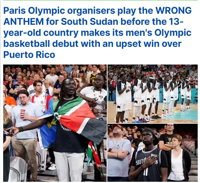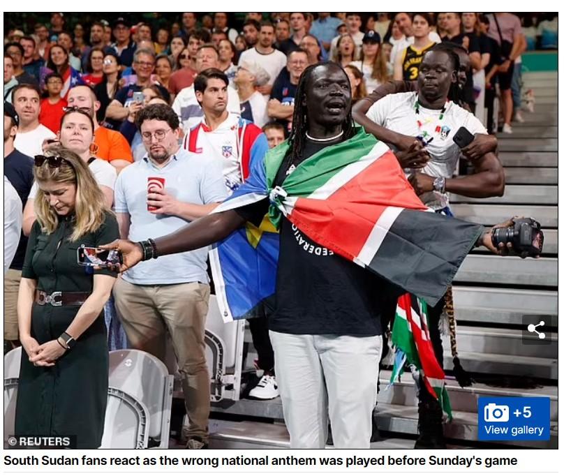 المهاجم نوني أوموت لاعب كرة السلة في جنوب السودان بعد عزف النشيد الوطني السوداني بدلا عن نشيد بلادهم؛ في أول مشاركة للفريق في الأولمبياد اليوم، الأحد.